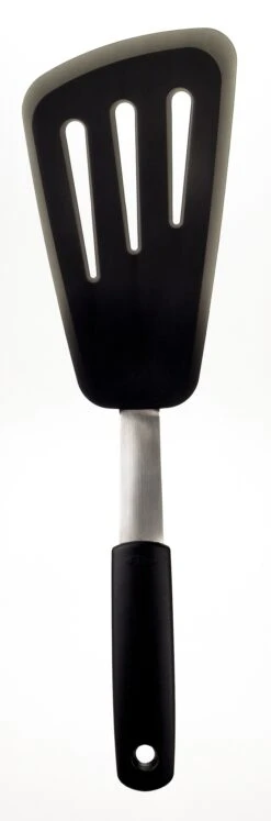 De OXO omeletspatel maakt het draaien van een omelet, hamburgers of pannenkoeken heel makkelijk. Dit komt door de dunne, flexibele randen. De spatel is gemaakt van een combinatie van roestvrij staal en flexibel siliconen. Dit maakt de spatel niet alleen stevig, maar ook fijn om mee te werken. De siliconen buitenlaag is hittebestendig tot 300°C. Het is veilig voor het gebruik in pannen met anti-aanbaklaag. De OXO omeletspatel is vaatwasbestendig en handig op te bergen aan een haakje dankzij het gaatje aan de onderkant van het handvat.